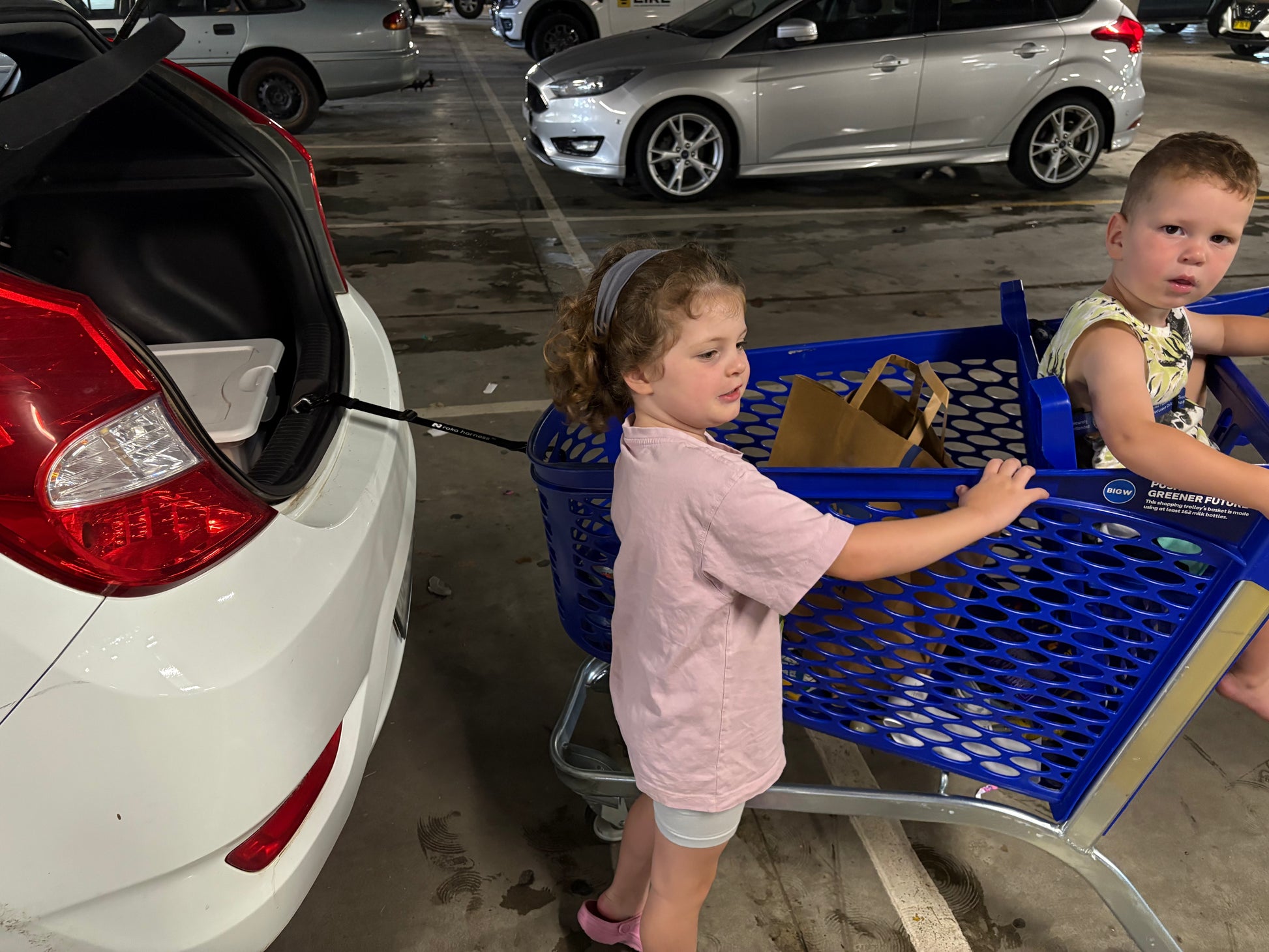Ensure no more shopping cart rollaways while your hands are full! Simply secure the harness to your car while you unload your groceries.